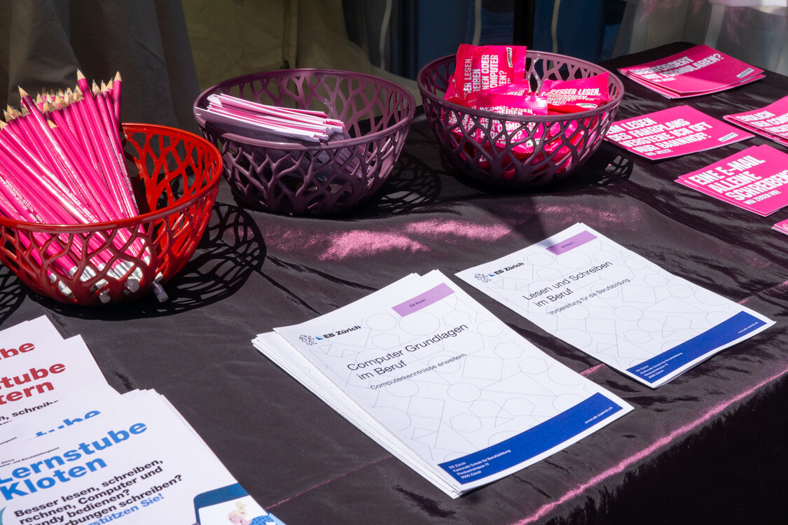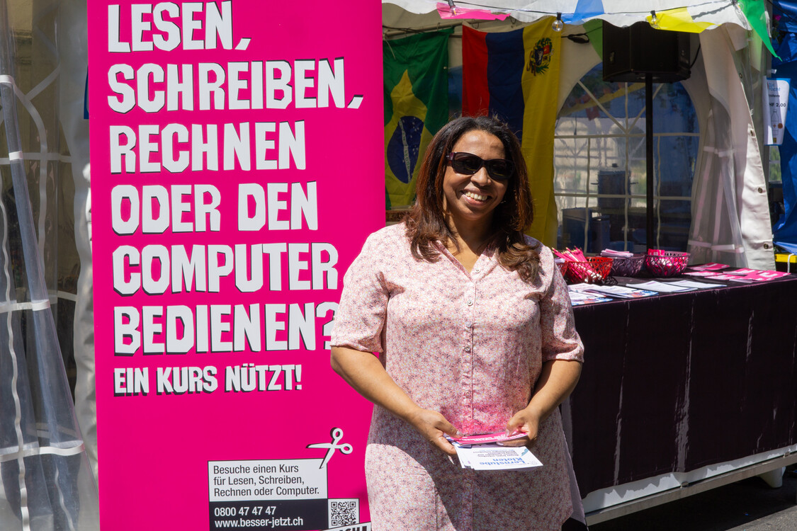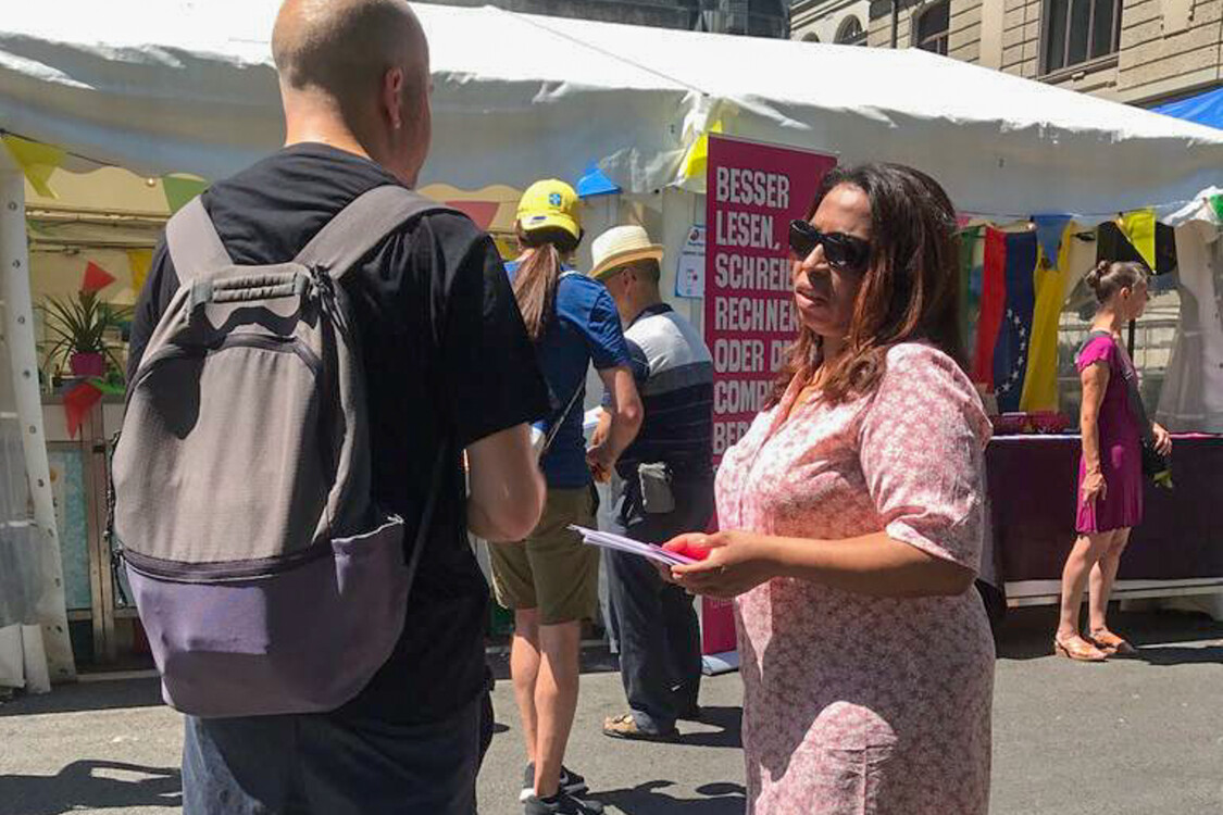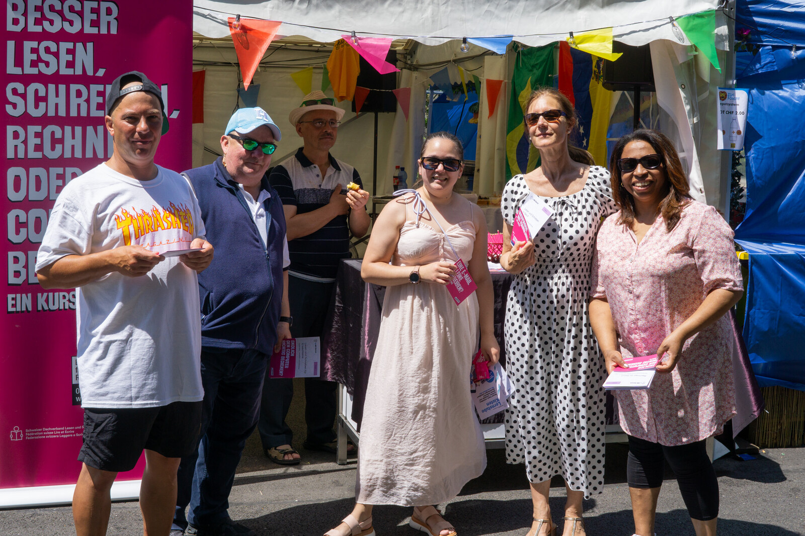 Eigentlich war es fast zu heiss, doch Christine Hintermann, Leiterin Botschafterprojekt Grundkompetenzen an der EB Zürich, und ihre ‘Botschafterin’ Maria sowie ‘Botschafter’ Gregor, Nicolas und René hatten diese Aktion gemeinsam beschlossen: Am diesjährigen Züri Fäscht wollten sie für Grundkompetenzen ‘weibeln’ und Fest-Besucher und Passantinnen auf diese Thematik aufmerksam machen und mit ihnen darüber sprechen.