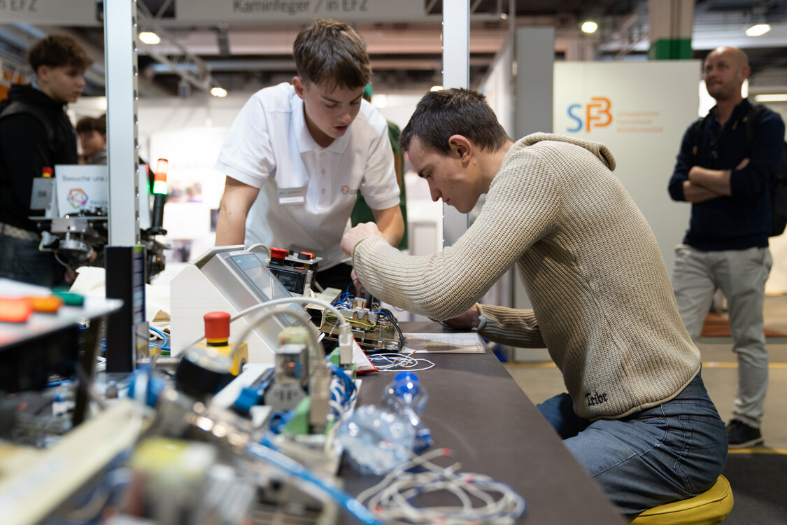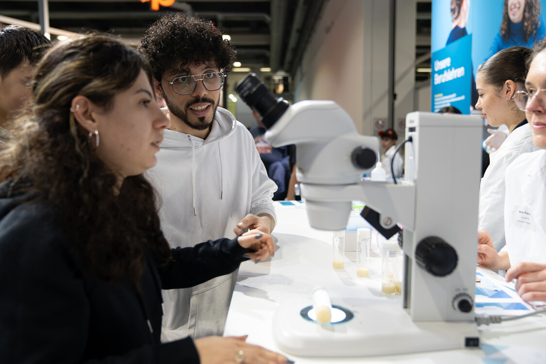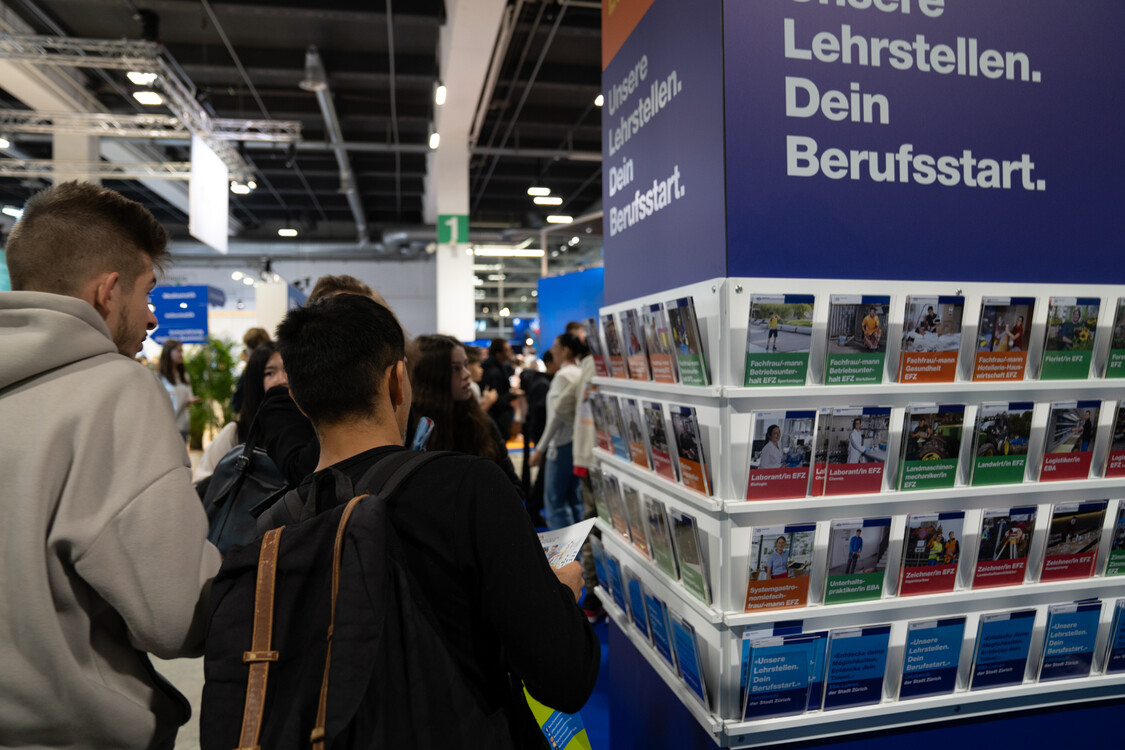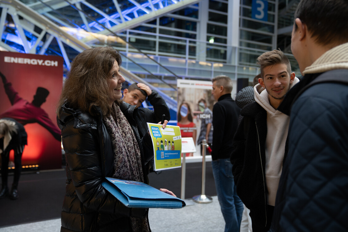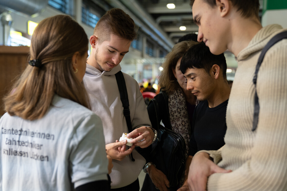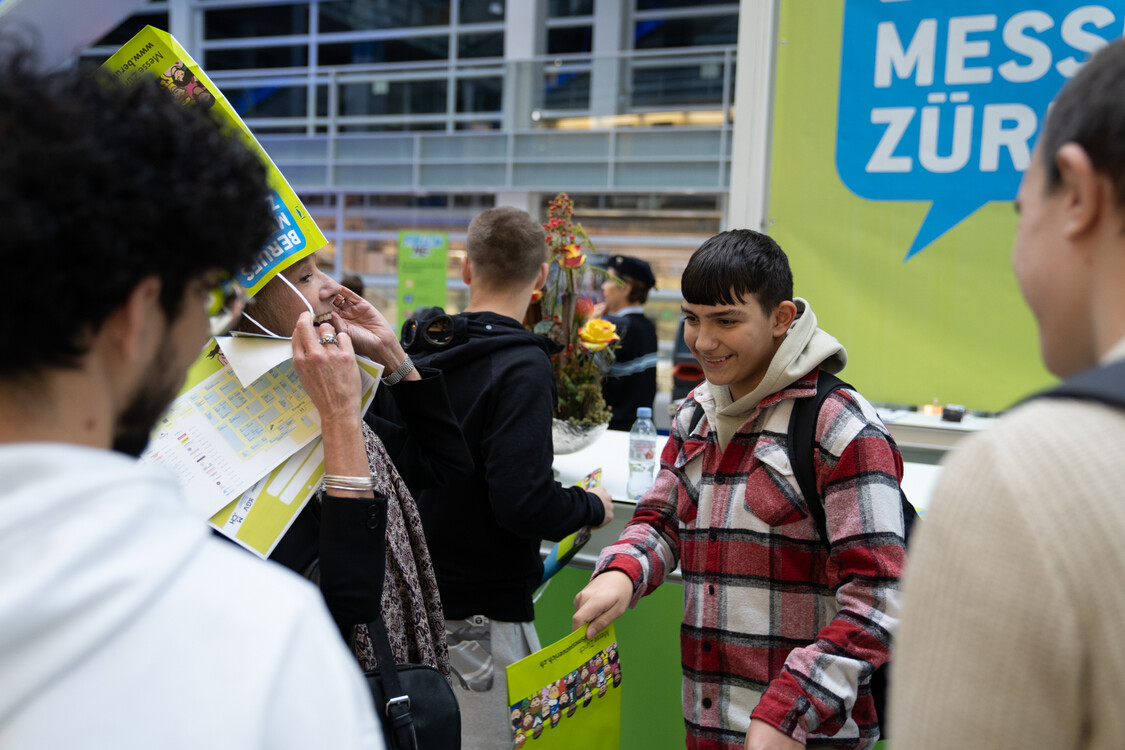 An der Berufsmesse in Zürich präsentierten rund 120 Berufsverbände, Schulen und Unternehmen ihre Grund- und Weiterbildungen. Yevhen (22 J.) und Yulian (21 J.) aus der Ukraine interessierten sich besonders für die Angebote im Bereich Medienproduktion und Informatik. Şara (22 J.), die ihre Ausbildung als Krankenschwester in der Türkei abbrechen musste, informierte sich über den Beruf Fachfrau Gesundheit und freute sich, dass sie an einer Puppe die Blutentnahme üben konnte. Rashid (27 J.), der in seiner Heimat Afghanistan Mechatronik studierte, hat sich zum Ziel gesetzt, in der Schweiz eine Lehrstelle als Automatiker oder Automobil-Fachmann zu finden.