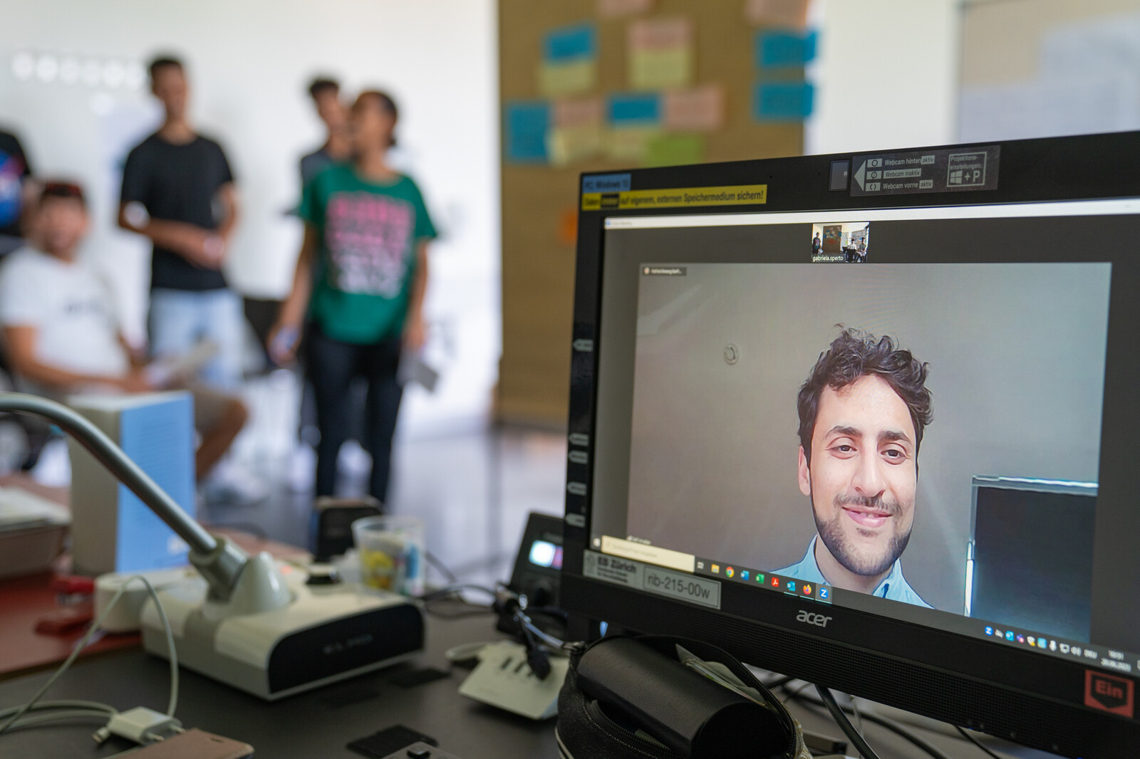 Eine Woche vor dem virtuellen Besuch von Seif Arsalan überlegten sich die Kursteilnehmer/innen Fragen an ihn. Teils bezogen sich diese auf das von ihnen gelesenen Buch «Aus Syrien geflüchtet», teils waren es persönliche Fragen zu Sport oder zur Rückkehr in seine Heimat. Und dann war Seif via Zoom im Kurs zugeschaltet. Die Jugendlichen sassen vor der Beamerwand im Halbrund, so dass sie ihn gut sehen konnten. Nofa, eine Kursteilnehmerin aus Syrien, stand auf und begrüsste ihren Landsmann Seif in ihrer Muttersprache. Er freute sich darüber und grüsste freundlich zuerst auf Syrisch, dann auf Deutsch zurück. Und nun begann Seif zu erzählen: