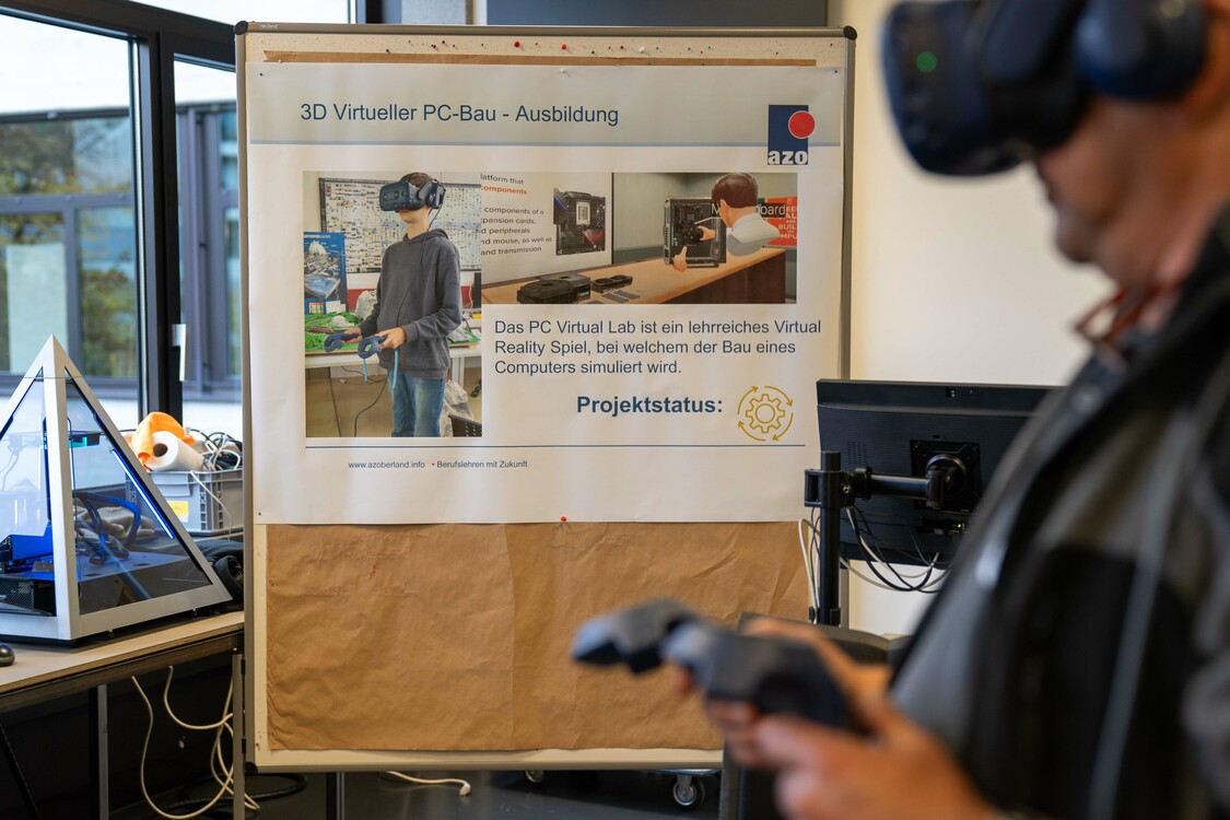 Am Meeting-Point des Ausbildungszentrums Zürcher Oberland (AZO) in Uster waren drei Lernende fleissig mit ihren VR-Brillen beschäftigt und montierten virtuell einen PC. Am Monitor konnte man sehen, wie sie zu einzelnen Komponenten griffen und diese am richtigen Platz einsetzten. Die entsprechenden Anforderungen gab ihnen das System vor. Das AZO setzt VR-Brillen bei ihren Ausbildungen ein, zum Beispiel bei derjenigen von Informatiker EFZ Applikationsentwicklung.